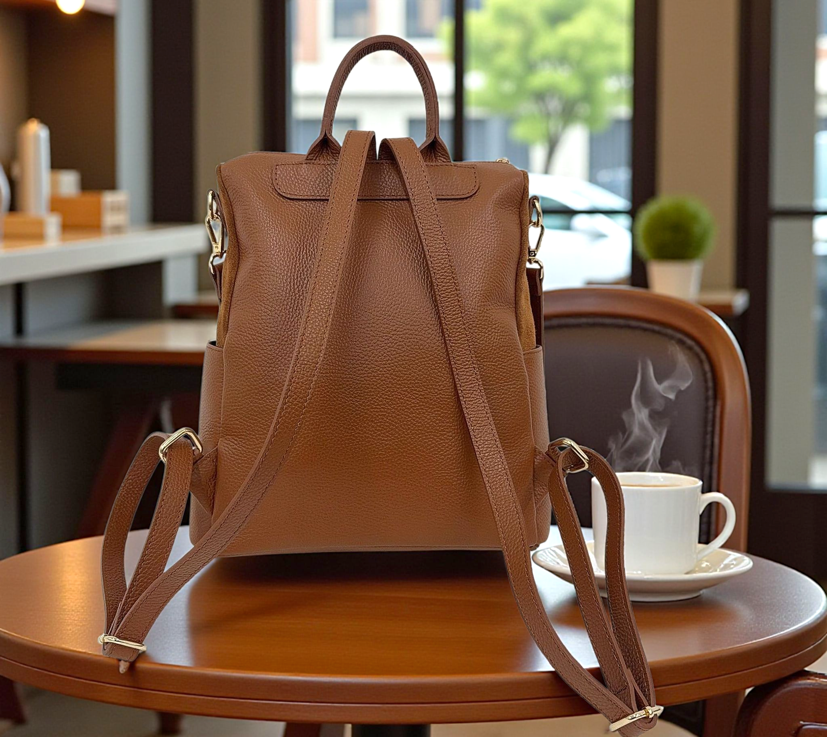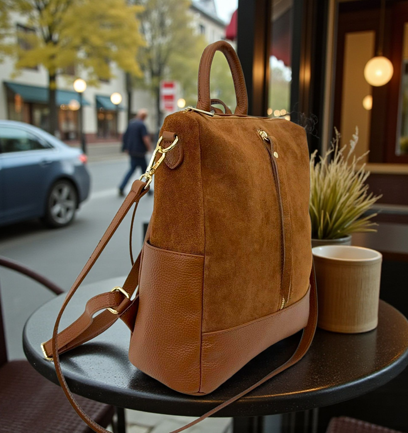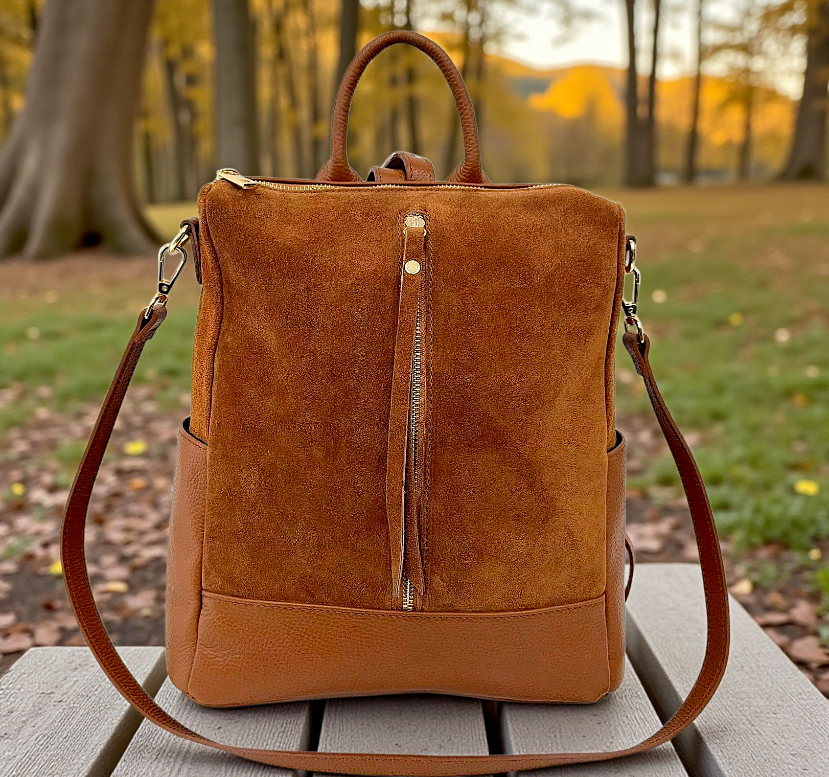 " Andrea " Straordinario Zaino convertibile in Borsa a mano e a tracolla, deciderai tu come usarlo!! In Pelle di Vitello " Dollaro " e in Pelle di Vitello " Nabuk " . Misure: L.30 X H.32 X 14 cm ; Chiusura in alto a Cerniera; Minuterie Color oro; Multi tasca. Troverai 2 Tasche aperte laterali più uno scomparto a cerniera frontale , e l interno è foderato in cotone a scomparto unico con tasca a cerniera. Essendo uno Zaino, nel retro ha i suoi Spallacci Regolabili, ma ha un Manico per portarlo a mano e la tracolla staccabile e regolabile tono su tono in dotazione per portarlo Cross-Body. Adattabile ad ogni Look, lo arricchirà senza dubbio, ma soprattutto amerai la sua comodità e la sua versatilità nel portarlo in ogni modo possibile !! Riceverai " Andrea " dotato di Busta Dust-Bag Antipolvere, cosi da poterlo riporre nel modo corretto e tutelato!