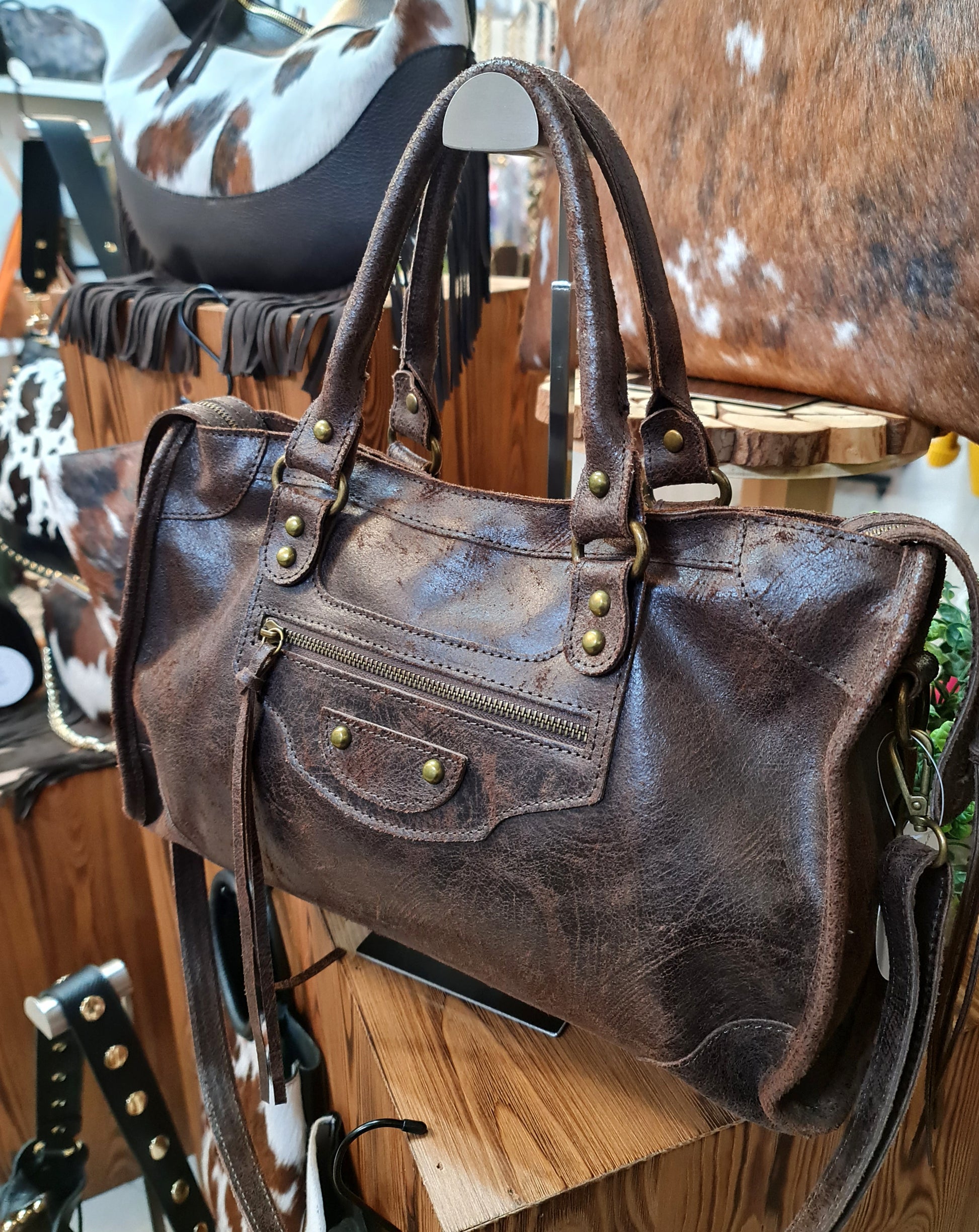 " ELOISA " e' una Borsa in Pelle Spazzolata, con doppio Manico portabile a mano, ma anche a spalla e Cross-Body avendo la tracolla inclusa staccabile e regolabile. Misure: L.39 x H.23 x P.13 cm; Minuterie in Ottone Vintage; Chiusura a cerniera; Interno foderato in cotone a scomparto unico con tasca interna a cerniera. Un modello Super apprezzato, per la sua comodità e versatilità, ispirato a Balenciaga, non sbaglia Mai!! Riceverai la tua "Eloisa" dotata di Busta Dust-Bug Antipolvere!