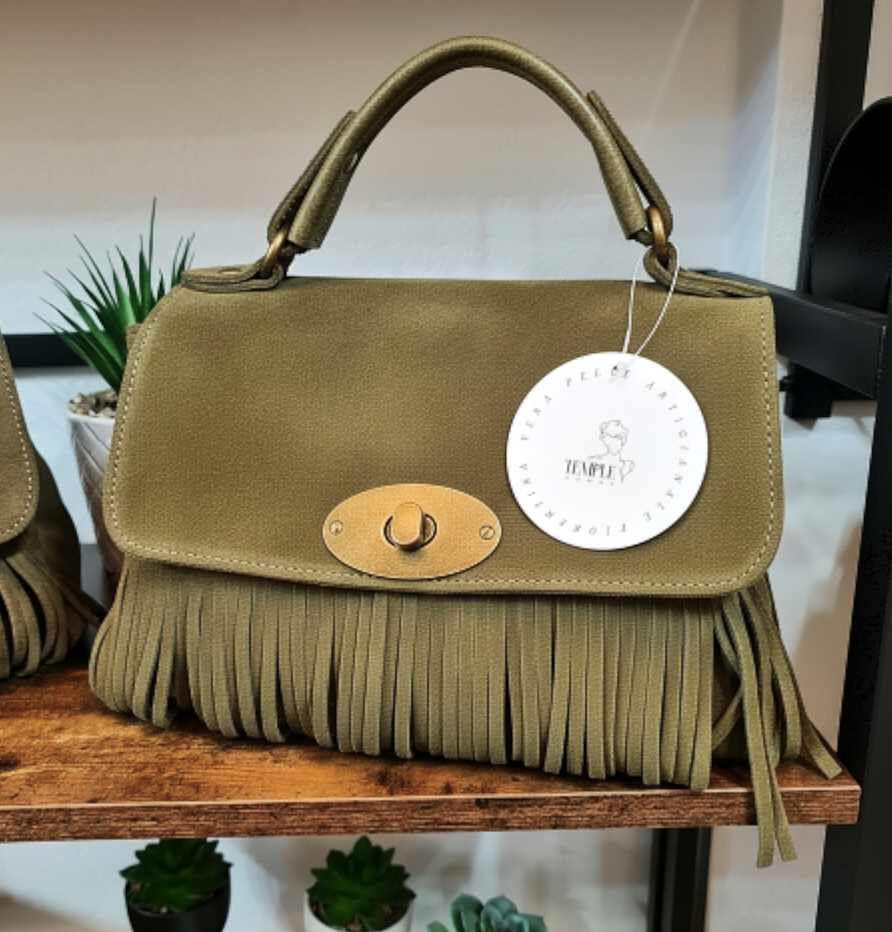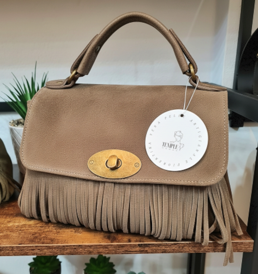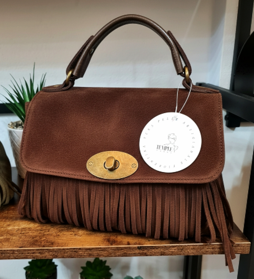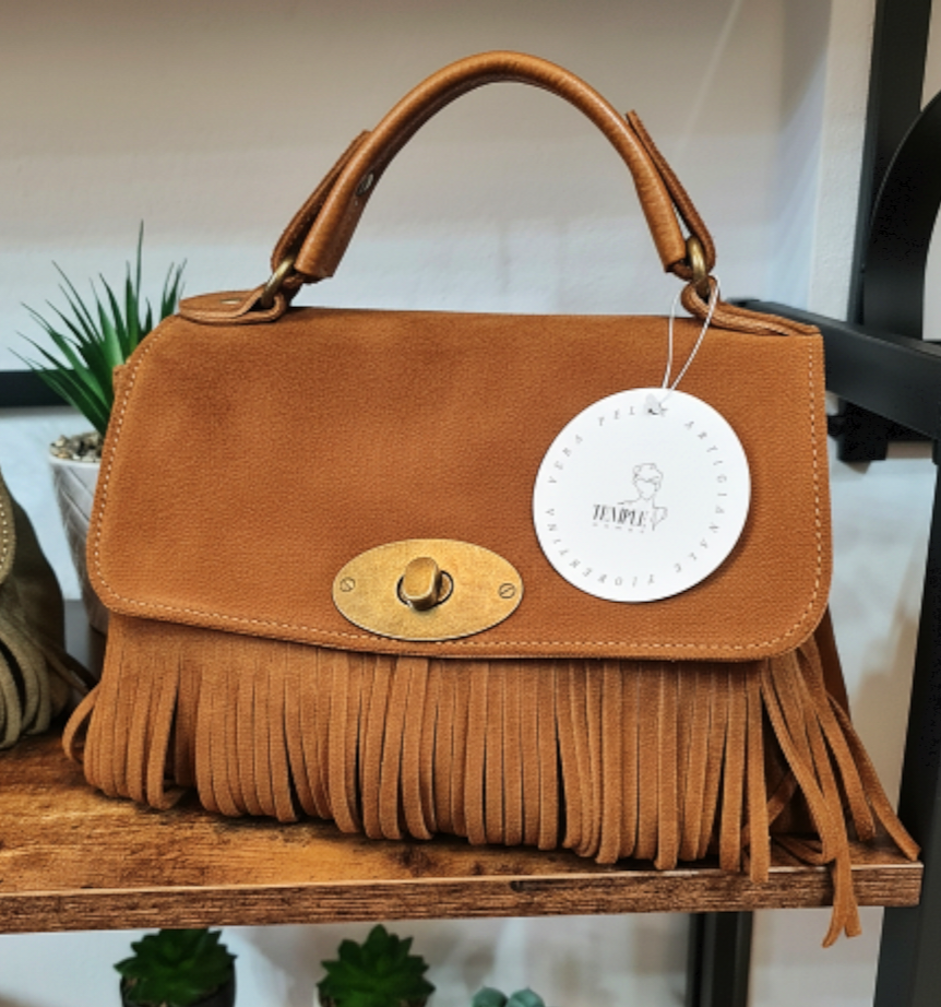 " IRIS " è un bellissimo Bauletto in Pelle di Vitello " Nabuk " e Pelle di Vitello " Dollaro ", arricchito nel Fronte da Frange Decorative. "IRIS" ha un manico unico, portabile a mano, e ha la sua tracolla staccabile e regolabile inclusa, per portarla a tracolla. La chiusura è con Girello e l'interno è foderato in cotone, suddiviso in due scomparti da tascone a cerniera, dal lato opposto ulteriore tasca a cerniera e un'altra tasca aperta in pelle; Minuterie in Ottone Vintage. Misure: L.28 X H.18 X P.10 cm; " IRIS " e adatta a chi ricerca Stile e comodità, la potrai adattare a qualsiasi tuo Out- Fit , senza esclusioni , rimarrà comunque una Protagonista Indiscussa !! Riceverai " IRIS " dotata di Busta Dust-Bag Antipolvere cosi da poterla riporre nel modo corretto e tutelata.
