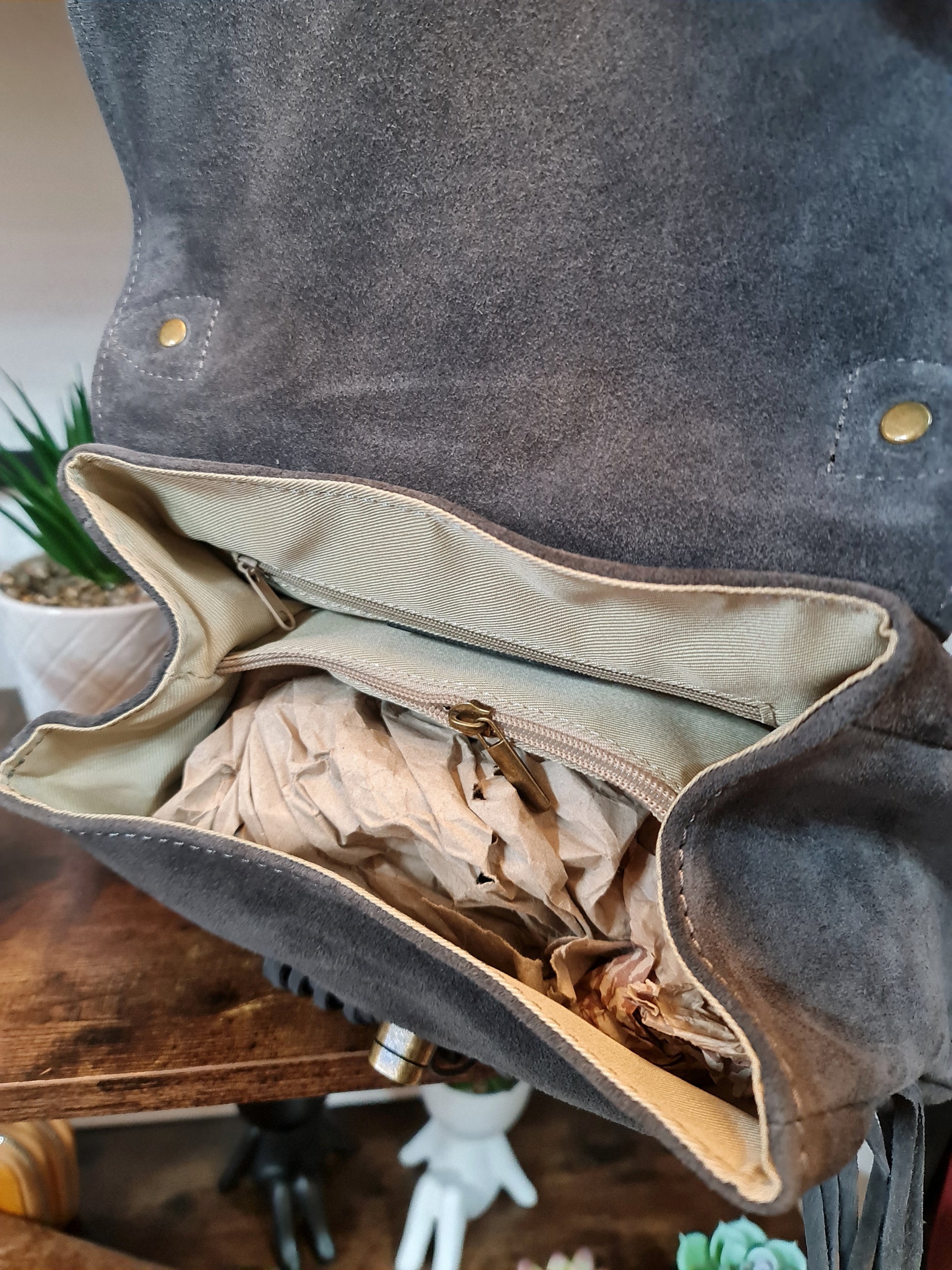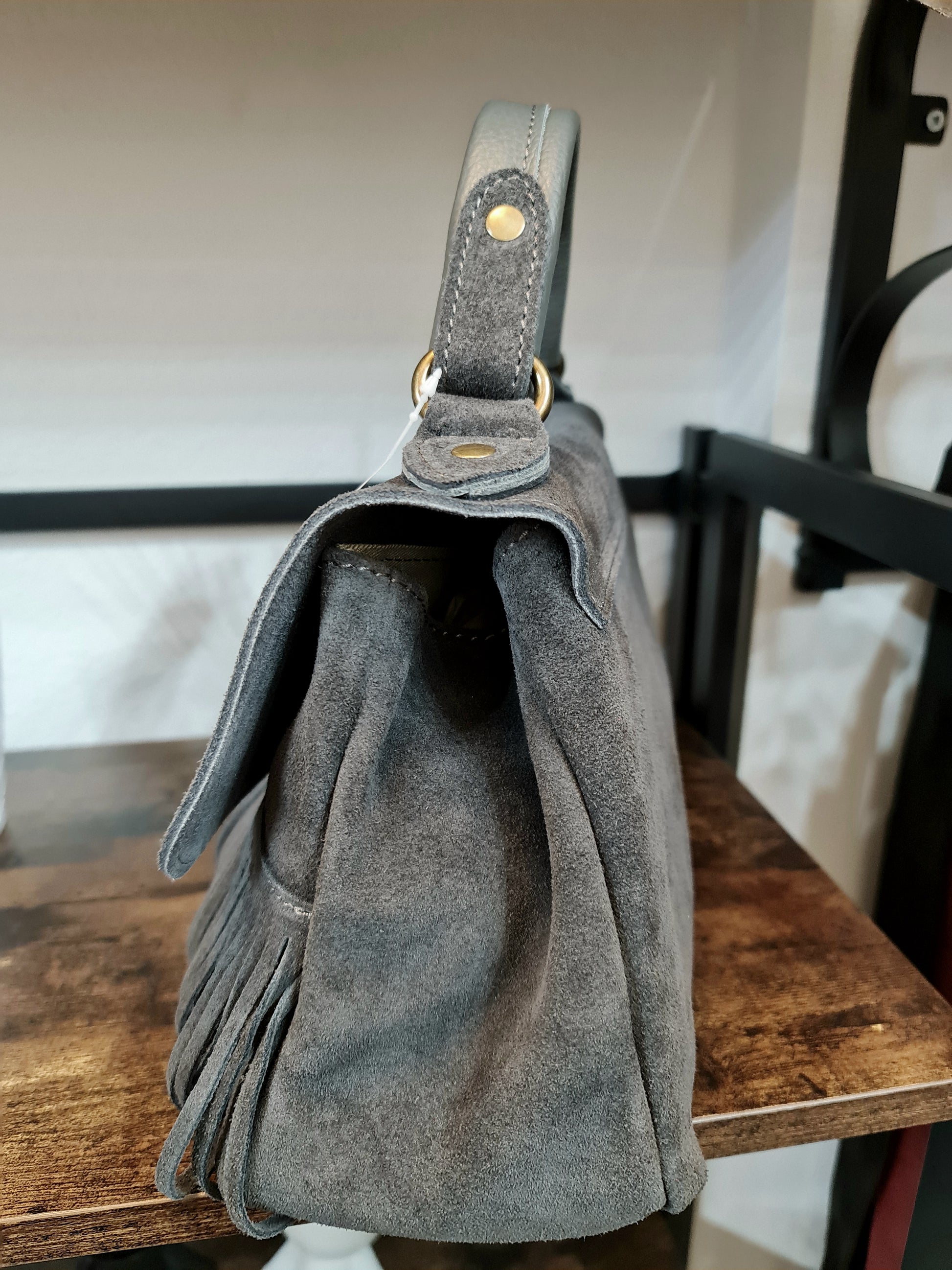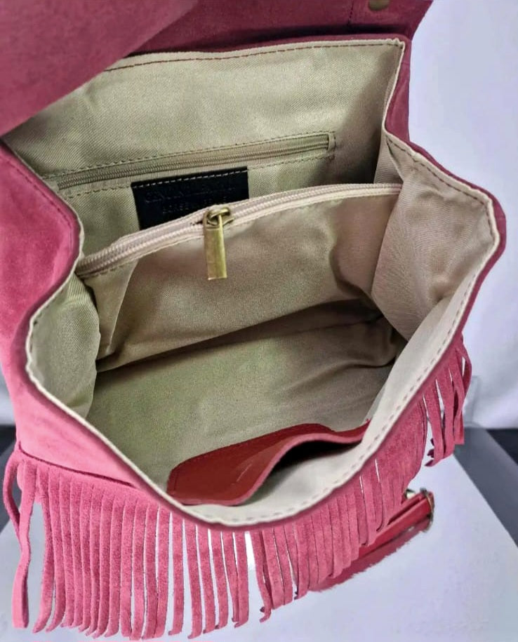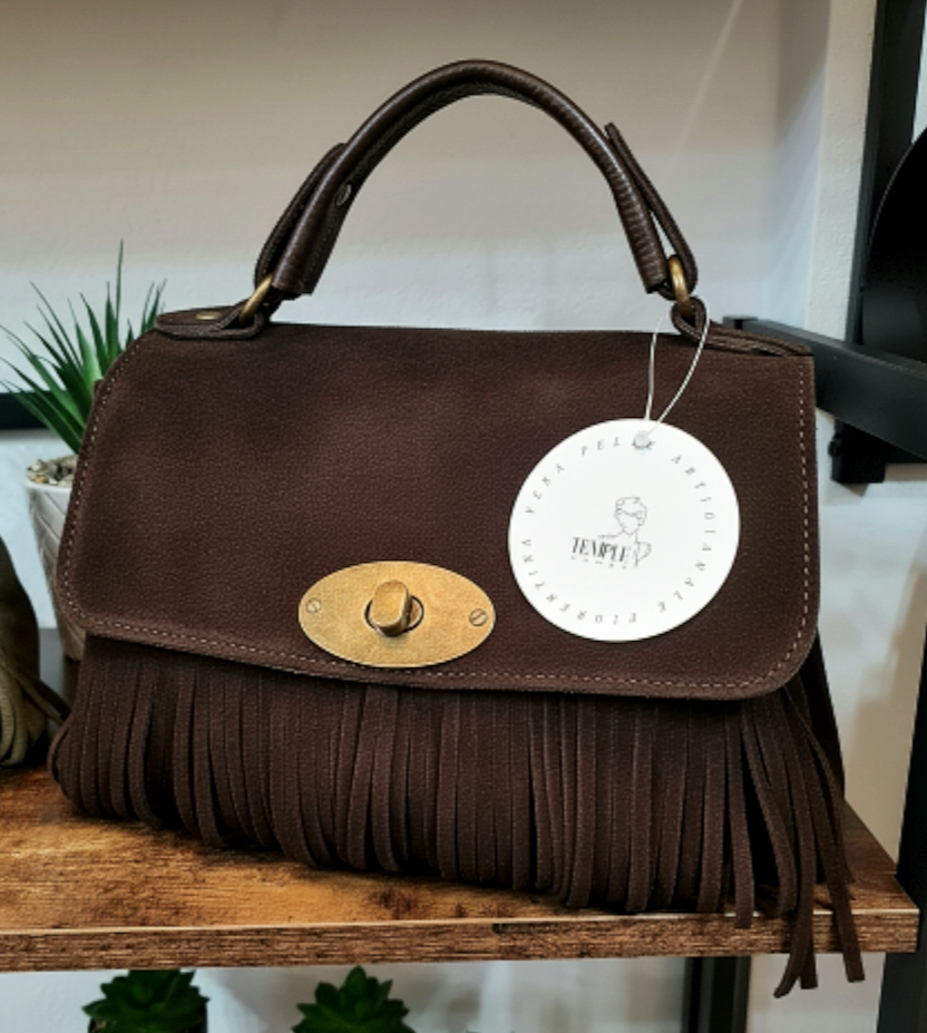 " IRIS " è un bellissimo Bauletto in Pelle di Vitello " Nabuk " e Pelle di Vitello " Dollaro ", arricchito nel Fronte da Frange Decorative. "IRIS" ha un manico unico, portabile a mano, e ha la sua tracolla staccabile e regolabile inclusa, per portarla a tracolla. La chiusura è con Girello e l'interno è foderato in cotone, suddiviso in due scomparti da tascone a cerniera, dal lato opposto ulteriore tasca a cerniera e un'altra tasca aperta in pelle; Minuterie in Ottone Vintage. Misure: L.28 X H.18 X P.10 cm; " IRIS " e adatta a chi ricerca Stile e comodità, la potrai adattare a qualsiasi tuo Out- Fit , senza esclusioni , rimarrà comunque una Protagonista Indiscussa !! Riceverai " IRIS " dotata di Busta Dust-Bag Antipolvere cosi da poterla riporre nel modo corretto e tutelata.