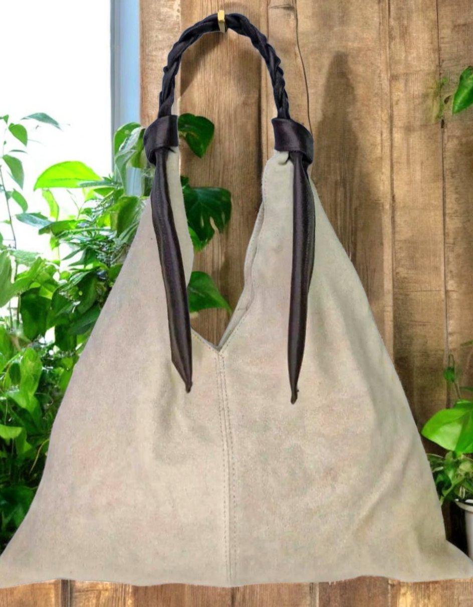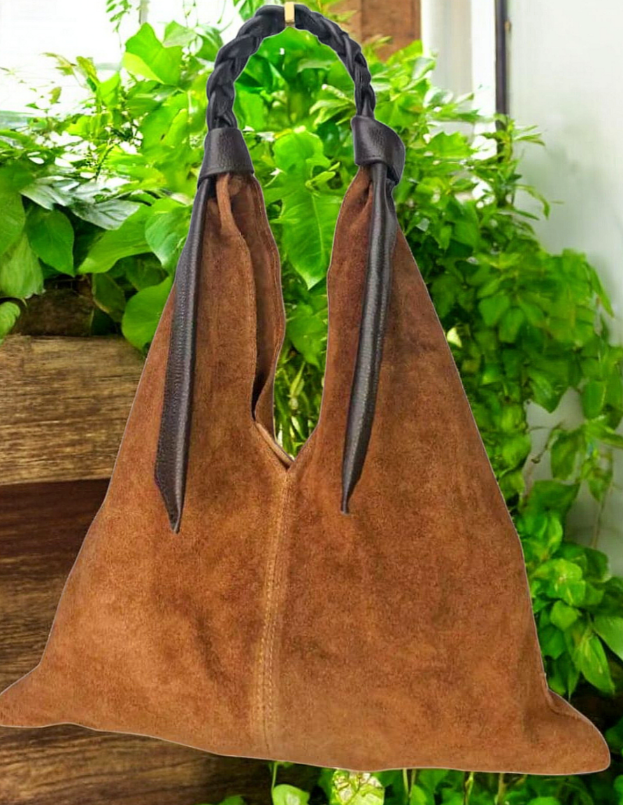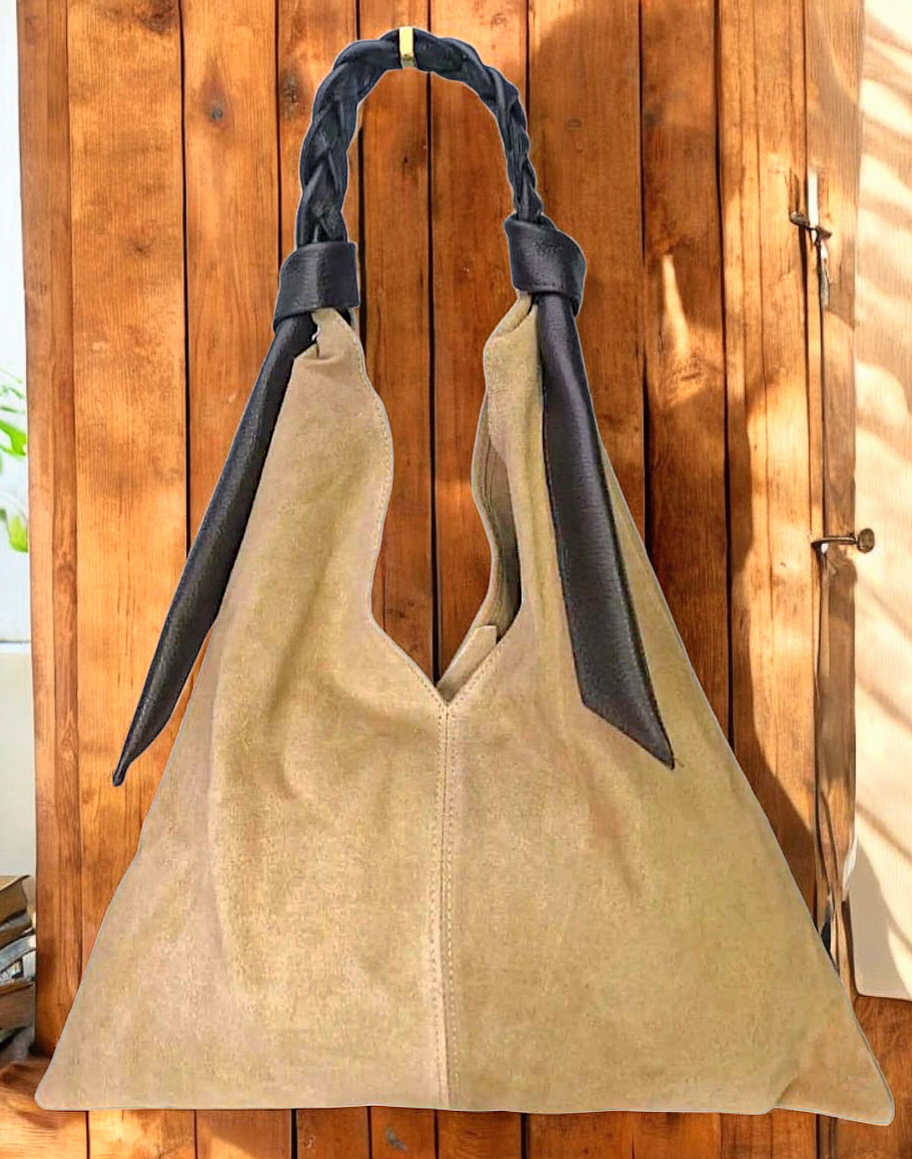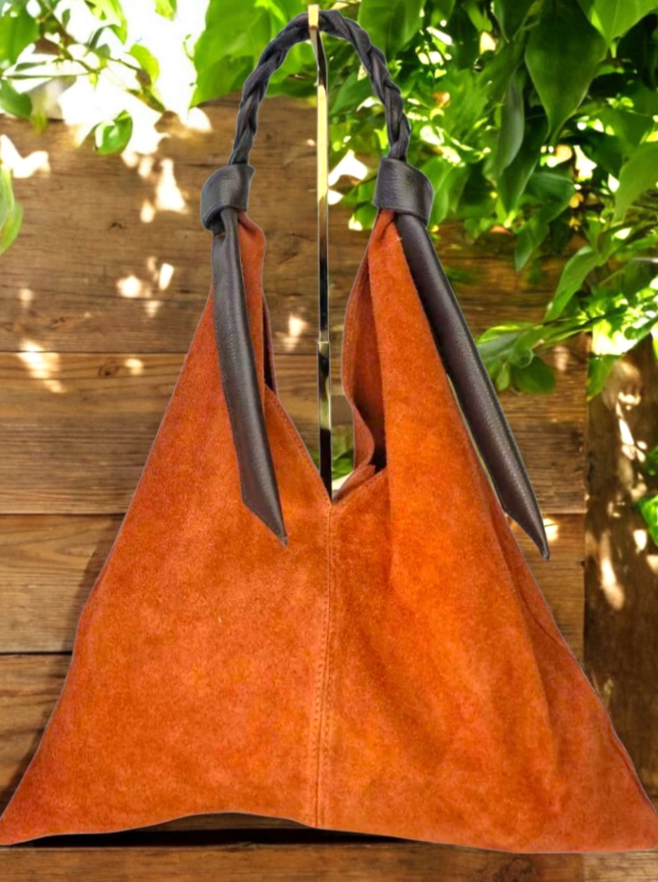 " Livia " è una Meravigliosa Maxi Shopper dalla Forma Triangolare, in Pelle di Vitello " Nabuk " e il manico è in Pelle di Vitello " Dollaro " intrecciato a mano, un Vero Capolavoro dei Nostri Mitici Artigiani Fiorentini!! Comoda, Versatile e Leggera, siamo sicuri che te ne innamorerai!!! Arricchirà in Modo inequivocabile ogni tuo Out-fit!! Misure: L.47 X H.48 X P.5 cm; Chiusura con Bottone Magnetico; Interno libero in pelle nabuk naturale. Riceverai la tua " LIVIA " dotata di Busta Dust-Bag Antipolvere cosi da poterla riporre nel modo corretto e tutelata.