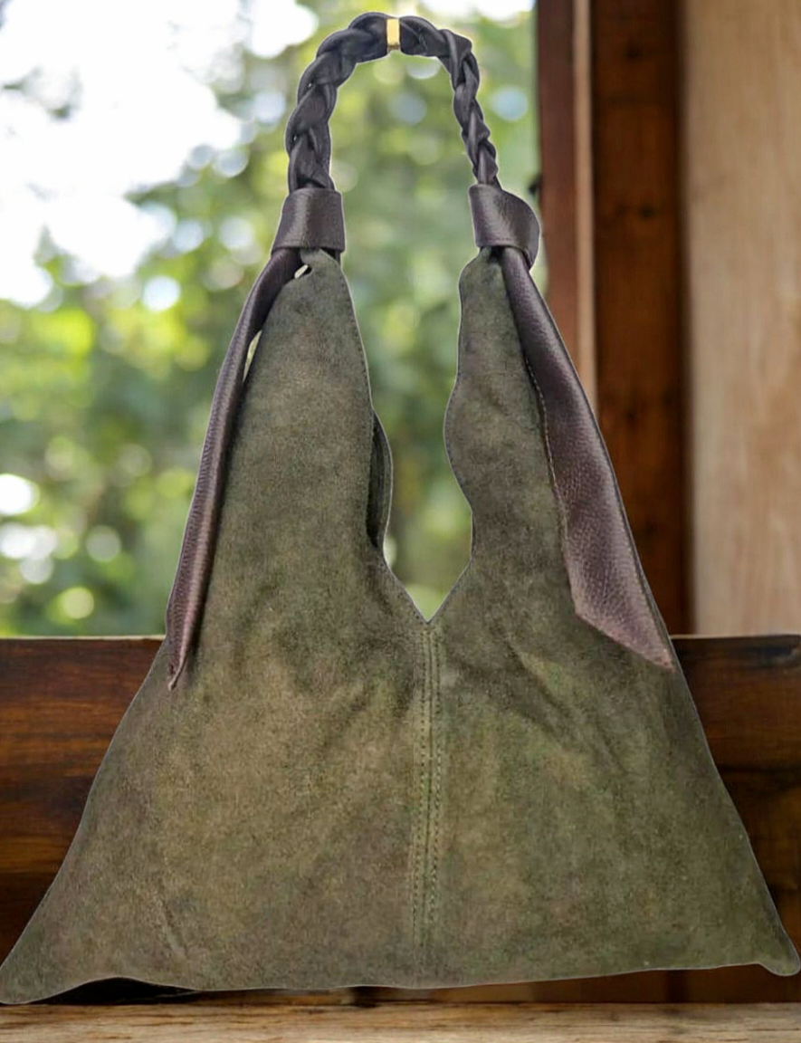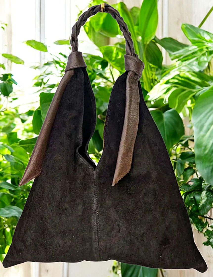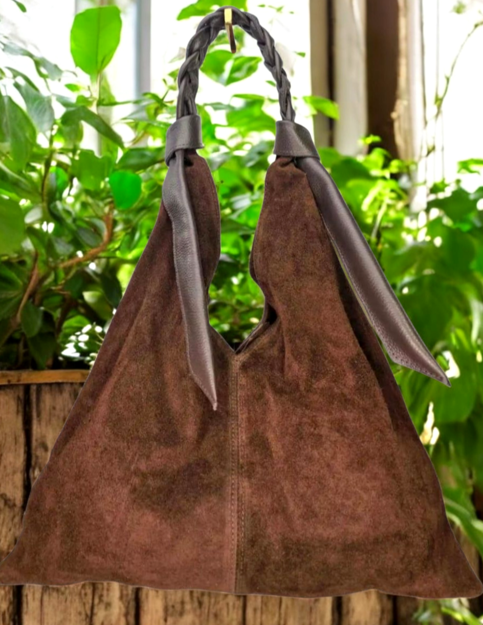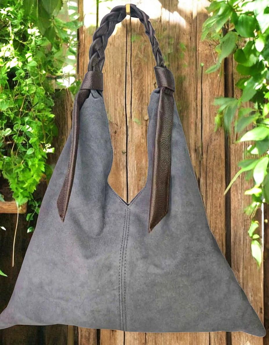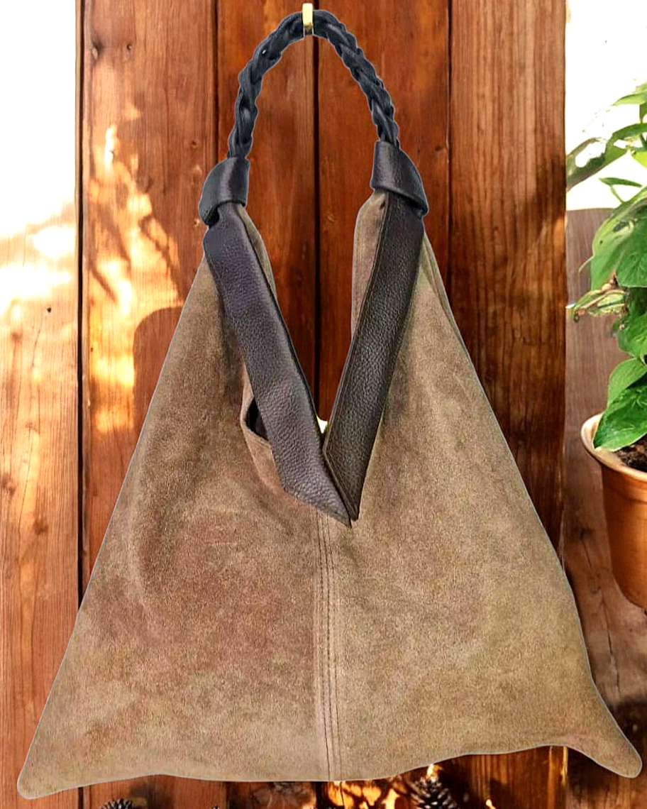 " Livia " è una Meravigliosa Maxi Shopper dalla Forma Triangolare, in Pelle di Vitello " Nabuk " e il manico è in Pelle di Vitello " Dollaro " intrecciato a mano, un Vero Capolavoro dei Nostri Mitici Artigiani Fiorentini!! Comoda, Versatile e Leggera, siamo sicuri che te ne innamorerai!!! Arricchirà in Modo inequivocabile ogni tuo Out-fit!! Misure: L.47 X H.48 X P.5 cm; Chiusura con Bottone Magnetico; Interno libero in pelle nabuk naturale. Riceverai la tua " LIVIA " dotata di Busta Dust-Bag Antipolvere cosi da poterla riporre nel modo corretto e tutelata.